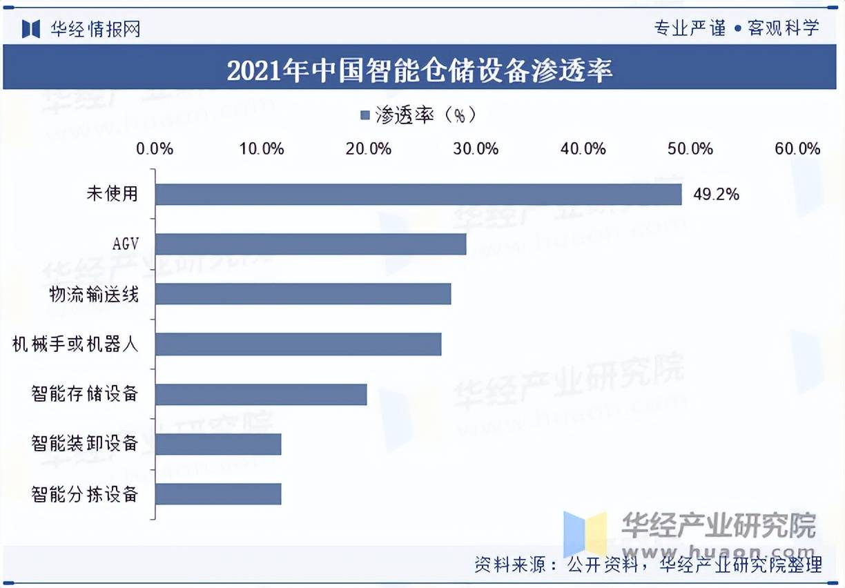 截止2021年,我国第二产业的数字经济渗透率仅为20%,相比之下,德国和韩国的第二产业数字经济渗透率均超过了40%。由此可见,与发到国家相比,我国的工业数字化水平仍显落后。据统计,截至2021年,我国仍有约49.2%的企业尚未使用任何智能仓储设备,而目前已经被使用的智能仓储设备的渗透率也均较低,其中渗透率最高的AGV设备的渗透率仅为29.04%,尚不足30%,相比之下,渗透率最低的智能分拣设备的渗透率仅为11.88%,市场仍存在较大空间。